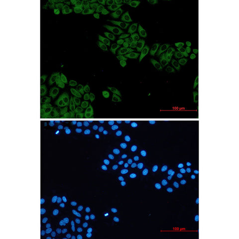 Immunocytochemistry analysis of VAV2 (green) in Hela using VAV2 antibody,and DAPI(blue).